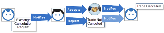 A cancellation can only be processed by the last two people who committed the trade. For example, suppose John trades with Ron and that trade is approved. Ron then trades that same day with Les and that trade is approved. John then decides he no longer needs the trade in effect and wants to cancel the trade, but John cannot cancel the trade because the trade is now between Ron and Les. However, Ron and Les can cancel and if they do, the trade goes into its previous state which was John and Ron, so from this point John may send a trade cancellation request.